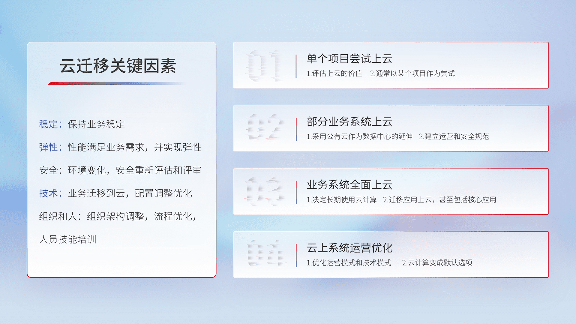 结合实际业务,,,从规划设计、、云平台选型、、云原生改造、、、、数据迁移、、、集成交付,,,迁移全过程为客户识别最佳上云路径,,做好风险识别管理,,,,设计网络架构、、、身份权限、、、安全审计合规、、、、操作审计、、、、日志审计、、、监控告警策略、、、多站点容灾设计等,,对云上基础设施进行整体规划,,提升IT治理水平,,,以满足弹性、、、高可用、、、高性能的需求。。